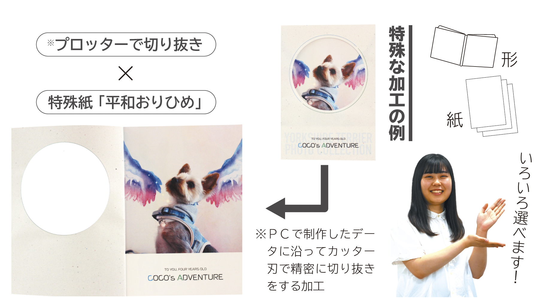 変形サイズや、製本方法も思い思いにカスタマイズいただけます。