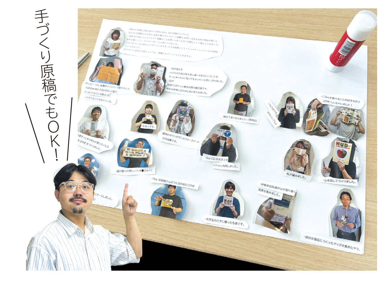 全部手描きする、それもZINEです。Wordで打った文章と写真をプリントアウトしてハサミで切って、のりで貼ってレイアウトする、それでもOK。